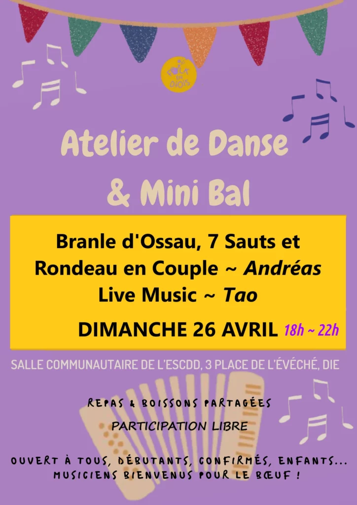 Pour découvrir ou redécouvrir des danses moins fréquentes dans le Diois que certaines autres – et vous permettre d’assurer pour le festival des Nuits du Folk 🙂 – on a décidé de faire un dernier atelier pour cette année scolaire !